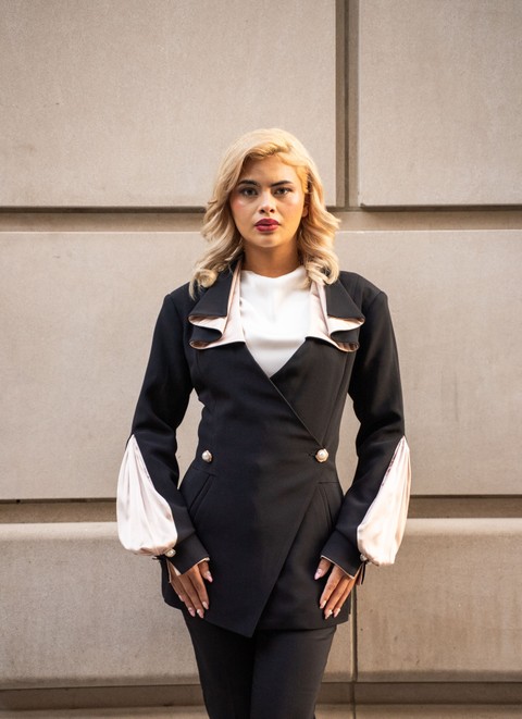 At the neckline, a cascade collar elegantly unfurls to reveal a contrast of textures—matte crepe folding into luminous silk—an intentional interplay of strength and fluidity. The double-breasted front is cut on a refined diagonal, visually narrowing the waist while offering extra coverage and shaping.