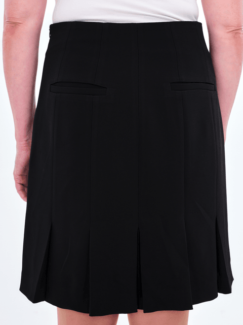 The front lays smooth and contoured, flattering the natural lines of the form with confidence. A basting-style stitch runs along the center back, drawing the eye toward a hidden silk-lined pleat—one of five thoughtfully engineered pleats that bring sculptural movement to the piece. These pleats open subtly with each step, allowing for ease, speed, and grace without compromising coverage. Whether ascending stairs or moving quickly through the city, the design ensures effortless fluidity without overexposure. Precise tailoring allows six meticulously placed pockets seamlessly integrated into the silhouette. The effect is a piece that celebrates form without sacrificing function.